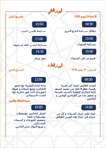 L’événement phare de cette édition sera la préparation de la plus grande gasaa de rfissa traditionnelle, avec un diamètre atteignant quatre mètres, dans une scène festive exceptionnelle illustrant l’esprit de solidarité et de travail collectif, et mettant à l’honneur la rfissa comme l’un des symboles emblématiques de la cuisine marocaine ancestrale ; cet exploit marquera sans doute un moment fort dans l’histoire du festival, attirera l’attention du public et des médias, et renforcera son image en tant qu’espace d’innovation, d’excellence et de valorisation du patrimoine.